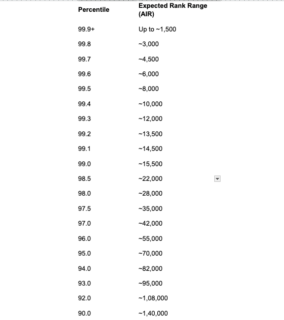 Although exact cutoffs vary by category, branch, and state quota, previous yearsβ data gives a realistic picture of how percentiles translated into ranks and seats.