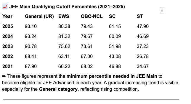 π The percentile needed just to qualify for JEE Advanced has steadily risen β from the high-80s to above ~93 for General category students.