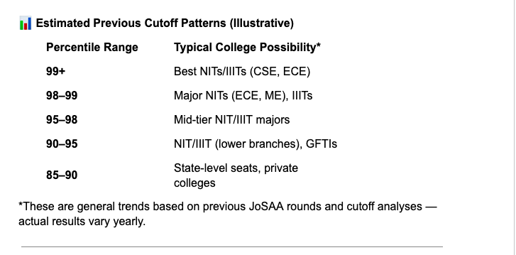 π For college admissions (NITs/IIITs), your percentile and final rank together determine eligibility β and even a small swing (e.g., from 95 to 97) can significantly change your chances at top branches.