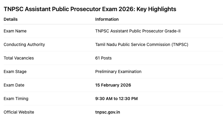 - The TNPSC Assistant Public Prosecutor Prelims Exam will be conducted on 15 February 2026
