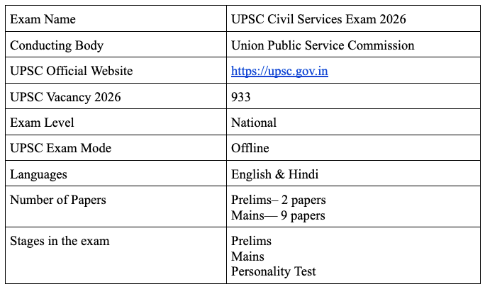 As of now, you know the exam dates, it's time to have a closer look at the exam conducting pattern, UPSC 2026 vacancies, and other related information: