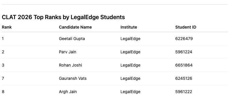 LegalEdge students have once again made a strong impact in the CLAT 2026 Rank List, securing multiple ranks within the Top 10 and Top 100.