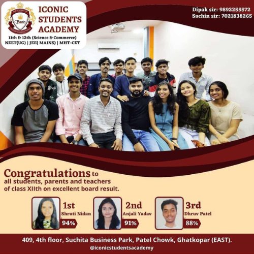 Iconic Students Academy is a premier educational institute located in Ghatkopar East, Mumbai, known for providing exceptional coaching in State Board, NEET, JEE, and MHT-CET examinations. Established with the vision of nurturing young minds and empowering them through quality education, Iconic Academy has become one of the most trusted names among students and parents seeking academic excellence in both Science and Commerce streams.