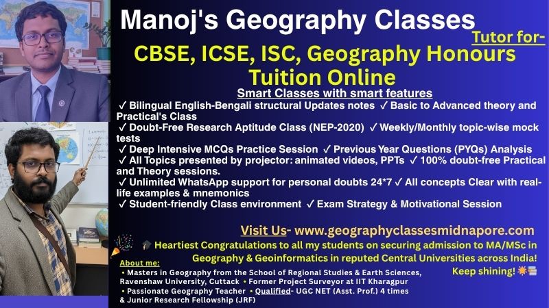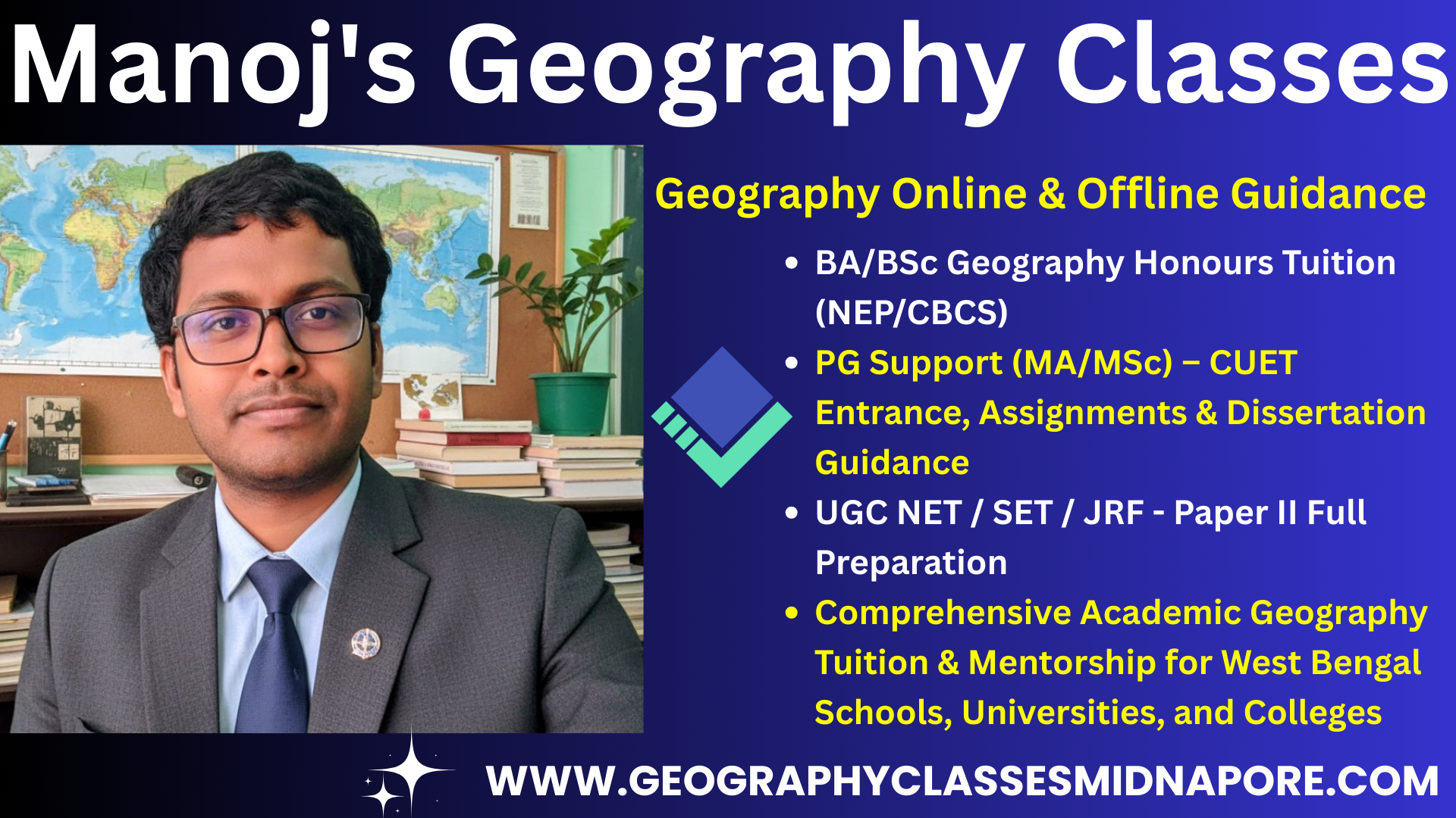 Join Manoj's Geography Classes for Best Geography Honours Teacher and tuition/tutor guidance in West Bengal for BA/BSc Geography Honours, MA/MSc Entrance, CUET, Remote Sensing–GIS and UGC NET / WBSET Guidance. Private tutoring for school (CBSE, ICSE), government college, autonomous (women’s) college, and university students is available at affordable tuition fees in offline near Midnapore City and online across West Bengal.