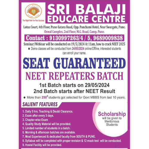 Welcome to Sri Balaji Educare Centre, a trusted name in education with over 15 years of experience in shaping the futures of aspiring doctors and engineers. We strongly believe that every student has immense potential to learn and excel, provided they receive the right guidance and support. Our mission is to nurture this potential by providing top-quality education that focuses on conceptual clarity, rigorous practice, and building the confidence needed to succeed in competitive exams. At Sri Balaji Educare Centre, we specialize in preparing students for medical entrance exams like NEET and engineering exams such as JEE. We understand that these exams are highly competitive, and success in them requires more than just hard work—it requires a strong foundation, systematic learning, and exposure to exam patterns. We pride ourselves on our experienced faculty team, consisting of highly qualified and passionate educators. Each teacher is a master of their subject and is committed to ensuring students grasp every topic thoroughly. Alongside teaching, we provide refined study material that covers the entire syllabus and includes worksheets for practice, ensuring that students gain both knowledge and confidence. To build exam temperament, we conduct regular mock tests that simulate the actual competitive exam environment. This prepares students not only academically but also mentally, helping them overcome stress and manage time effectively during real exams.