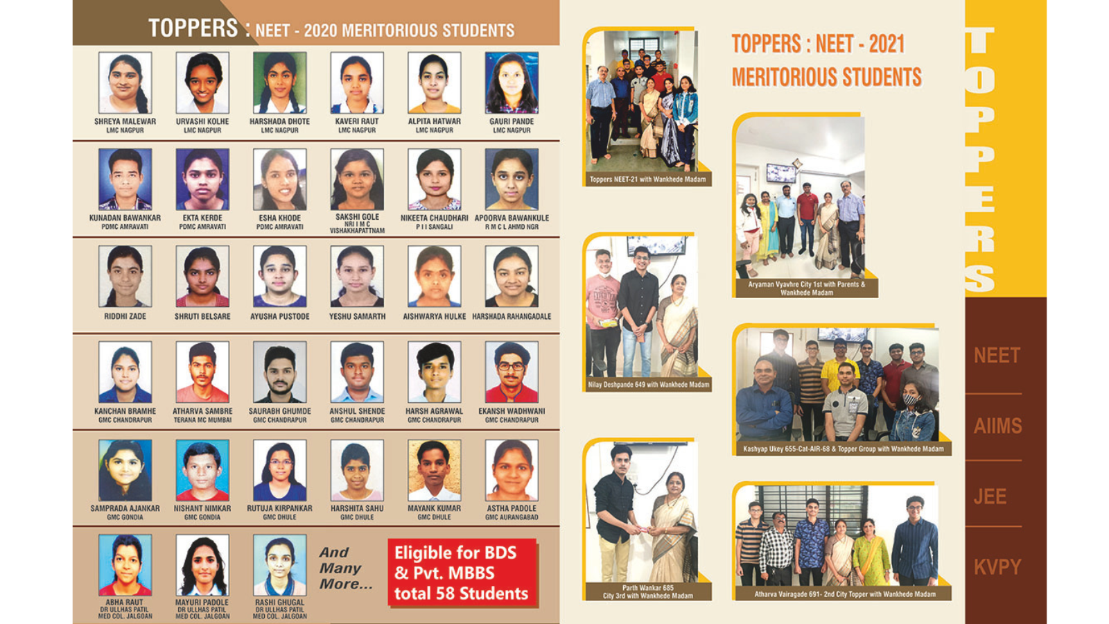Established in 2005, Wankhede Madam’s Academy (WMA) has become a name synonymous with excellence in competitive exam preparation in Vidarbha. Over the years, the institute has grown into one of the premier destinations for Medical (NEET-UG, AIIMS) and Engineering (IIT-JEE, NITs) entrance coaching. With nearly two decades of unwavering dedication, WMA has crafted a legacy of academic brilliance and result-oriented teaching. The academy is not just a coaching institute but a launchpad where aspirants transform their ambitions into tangible success. The academy’s remarkable achievements stand as proof of its consistent quality and commitment: 4,000+ students have secured admissions in top MBBS colleges, including AIIMS (Delhi, Nagpur), Maulana Azad (Delhi), KEM, COOPER, JJ, BJ Pune, GMC & IGMC Nagpur, and other reputed government and semi-government medical colleges. 4,700+ students have successfully entered IITs, NITs, and leading engineering colleges across India. At the heart of WMA’s pedagogy lies a student-centric, disciplined, and well-structured approach. Every student is nurtured with the right mix of conceptual clarity, rigorous practice, personalized mentoring, and strategic guidance. This ensures not only success in entrance examinations but also the development of critical thinking, time management, and confidence. Vision To stand as Vidarbha’s premier coaching institution, empowering every dedicated aspirant to realize their dreams of becoming medical or engineering professionals. The vision extends to creating an institution recognized for excellence, holistic development, and empowering future leaders. Mission Deliver engaging and effective coaching through highly qualified faculty and personalized learning strategies. Provide holistic support, including academic mentoring, doubt-solving sessions, rigorous test series, and continuous assessment. Instill confidence, discipline, and strategic acumen in students to help them excel in national-level competitive exams.