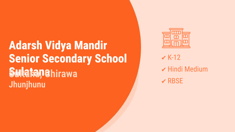 Adarsh Vidya Mandir Senior Secondary School Sulatana is a well-established educational institution located in Village Sultana, Tehsil Chirawa, Jhunjhunu district of Rajasthan. Founded in the year 2000, this co-educational school has been serving the educational needs of the local community for over two decades. Affiliated with the Rajasthan Board of Secondary Education (RBSE), the school offers comprehensive K-12 education from primary to senior secondary levels. The school operates with Hindi as the primary medium of instruction, making education accessible to local students while maintaining cultural relevance. With a dedicated faculty of 14 teachers, including 12 postgraduate and 2 graduate educators, the school ensures quality academic guidance with an impressive teacher-student ratio. The institution boasts modern infrastructure with 15 well-equipped classrooms, separate toilet facilities for boys and girls, and essential amenities like a library, laboratories, and play areas. The school's commitment to holistic development is evident through its various facilities including robotics labs, first aid provisions, and recreational spaces. With a remarkable 100% selection ratio, the school has established itself as a trusted educational institution in the Chirawa region, preparing students for both board examinations and future academic pursuits while maintaining strong values and discipline.