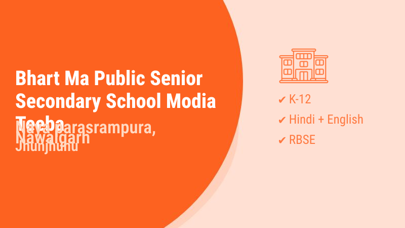 Bhart Ma Public Senior Secondary School, Modia Teeba is a well-established educational institution located in Naya Parasrampura, Nawalgarh, Jhunjhunu district of Rajasthan. Founded in 1998, the school has been serving the community for over 25 years, providing quality K-12 education under the Rajasthan Board of Secondary Education (RBSE) for both classes 10 and 12. The school operates in both Hindi and English mediums, catering to diverse linguistic preferences of students and families in the region. With a dedicated faculty of 15 teachers, including 13 regular staff members and 2 part-time educators, the school maintains a strong academic foundation. The teaching staff comprises well-qualified professionals with 10 post-graduates, 3 graduates, and 2 bachelor's degree holders, ensuring comprehensive subject expertise. The school boasts 22 well-equipped classrooms spread across its campus, providing adequate learning spaces for students. As a co-educational institution, it promotes inclusive learning environment for both boys and girls. The school has achieved a 100% selection ratio, demonstrating its commitment to academic excellence and student success. Located in the heart of Nawalgarh, it serves as a cornerstone educational institution for the local community, combining traditional values with modern educational approaches.