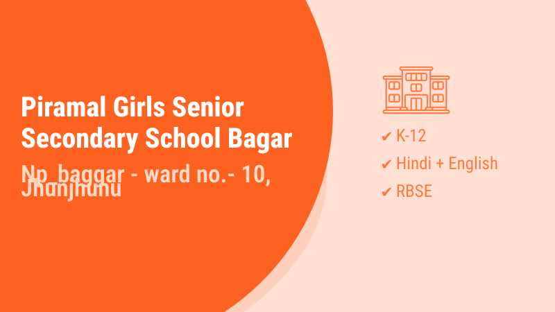 Piramal Girls Senior Secondary School, Bagar is a prestigious educational institution established in 1937, making it one of the oldest schools in the Jhunjhunu district of Rajasthan. Located at Ward No. 10, near Post Office in Bagar, this school has been serving the educational needs of girls for over 85 years. The school is affiliated with the Rajasthan Board of Secondary Education (RBSE) and offers quality education from K-12 levels. With a dedicated faculty of 18 teachers, including 16 post-graduates, the school maintains high academic standards. The institution operates in both Hindi and English medium, providing flexibility for students from diverse linguistic backgrounds. The school boasts modern infrastructure with 18 well-equipped classrooms, computer labs, robotics labs, and a comprehensive library. Safety and hygiene are prioritized with proper washroom facilities for girls and first aid provisions. The school encourages holistic development through various facilities including a playground area and kids' play area. With a 100% selection ratio, the school demonstrates excellent academic performance. The co-educational classes at certain levels promote inclusive learning. Under the able leadership of Headmistress Uma Purohit, the school continues to uphold its legacy of providing quality education while adapting to modern educational requirements and preparing students for future challenges.